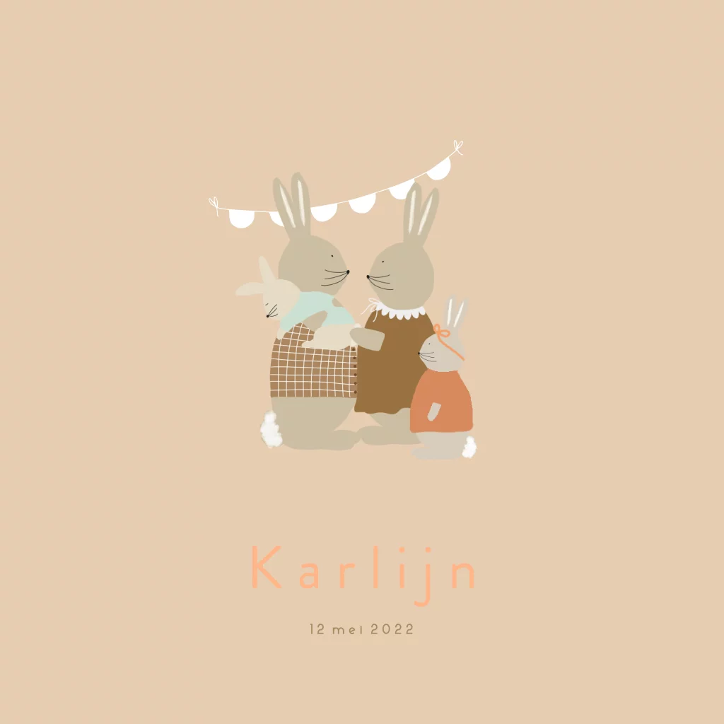 Een lief geboortekaartje met frisse kleurtjes, en konijntjes. Kleur van de kaart en de tekst kan gewijzigd worden.
