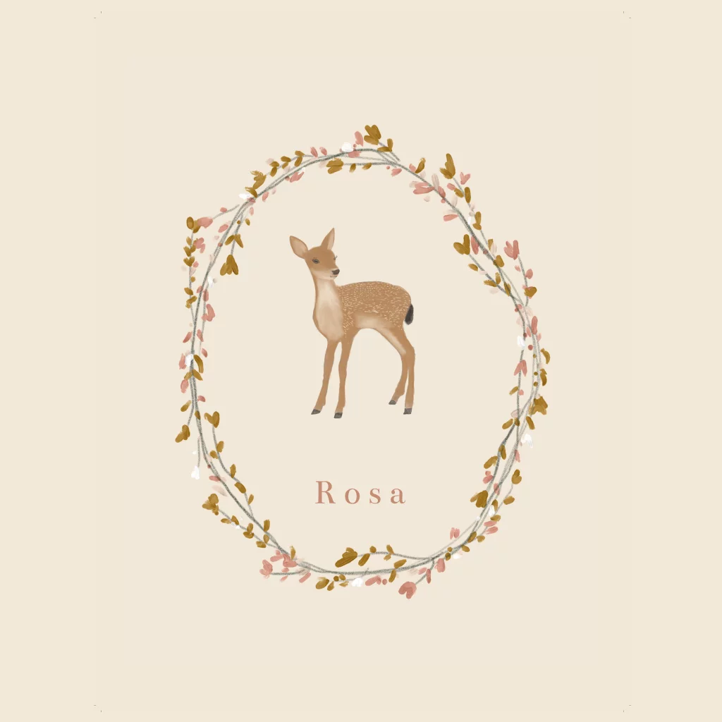 Een heel lief geboortekaartjes met ronde hoeken met een kleine bloemetjes krans en een hertje geschilderd.