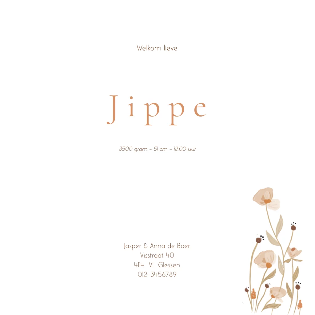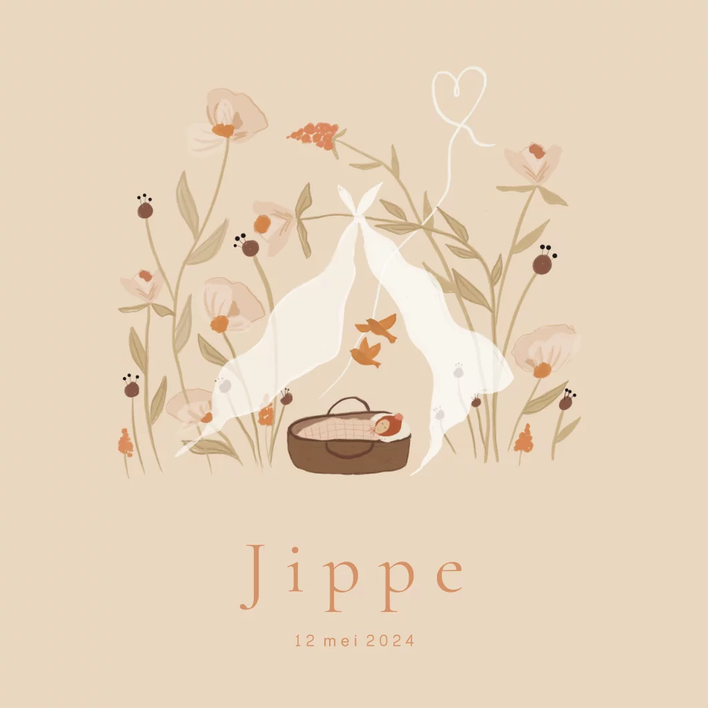 Een mooi sprookjesachtig geboortekaartje met bloemen en een mandje met een baby. Achtergrond kleur kan gewijzigd worden.