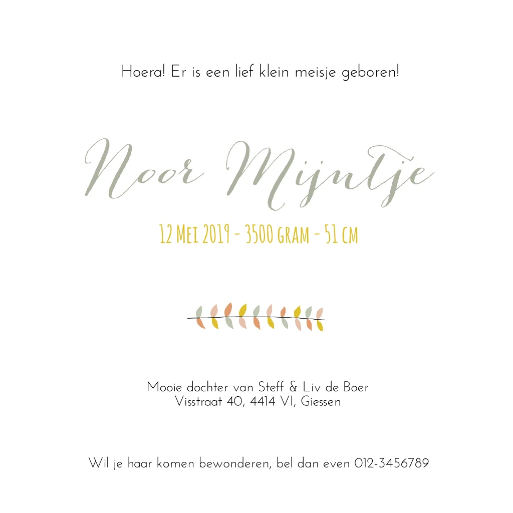 Een lief geboortekaartje met blaadjes. Een geboortekaartje in warme kleuren, deze is ook te bestellen in een ander formaat. Heb je vragen? mail ons gerust.