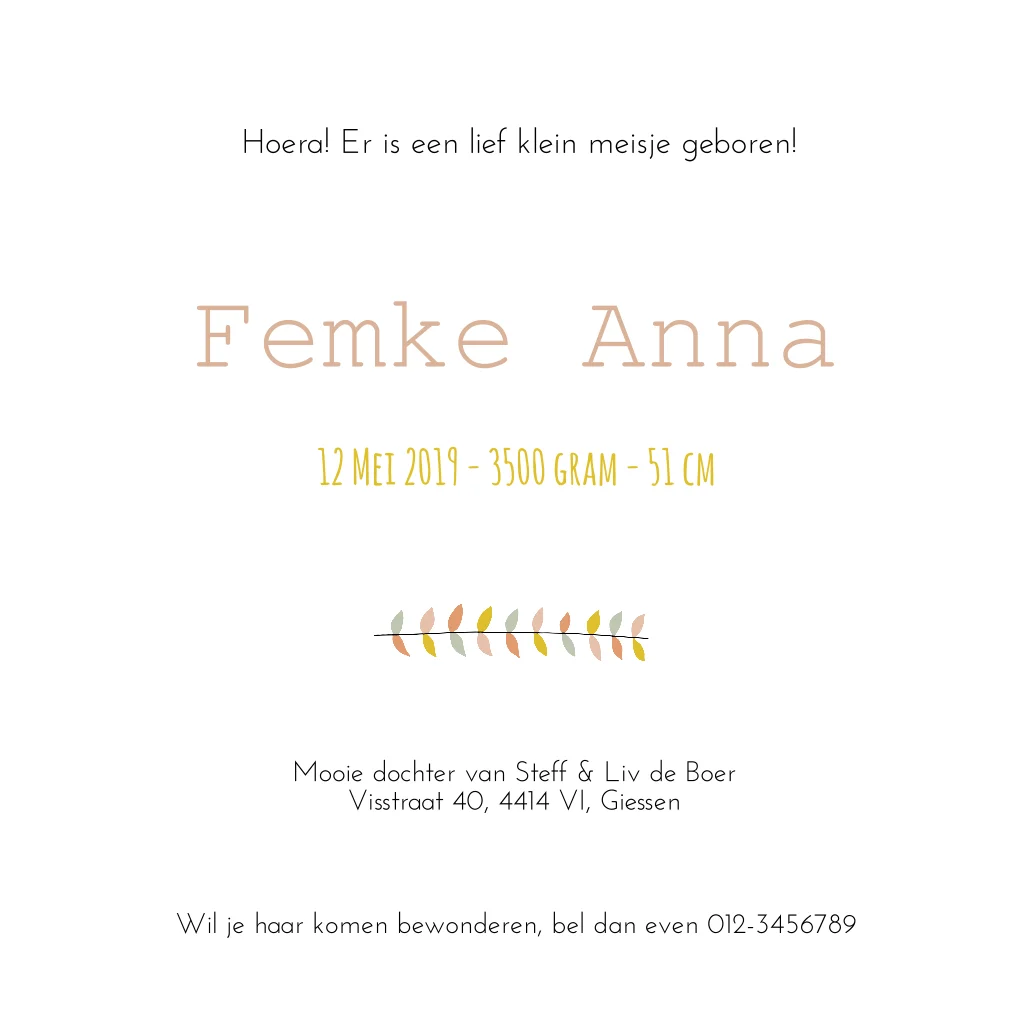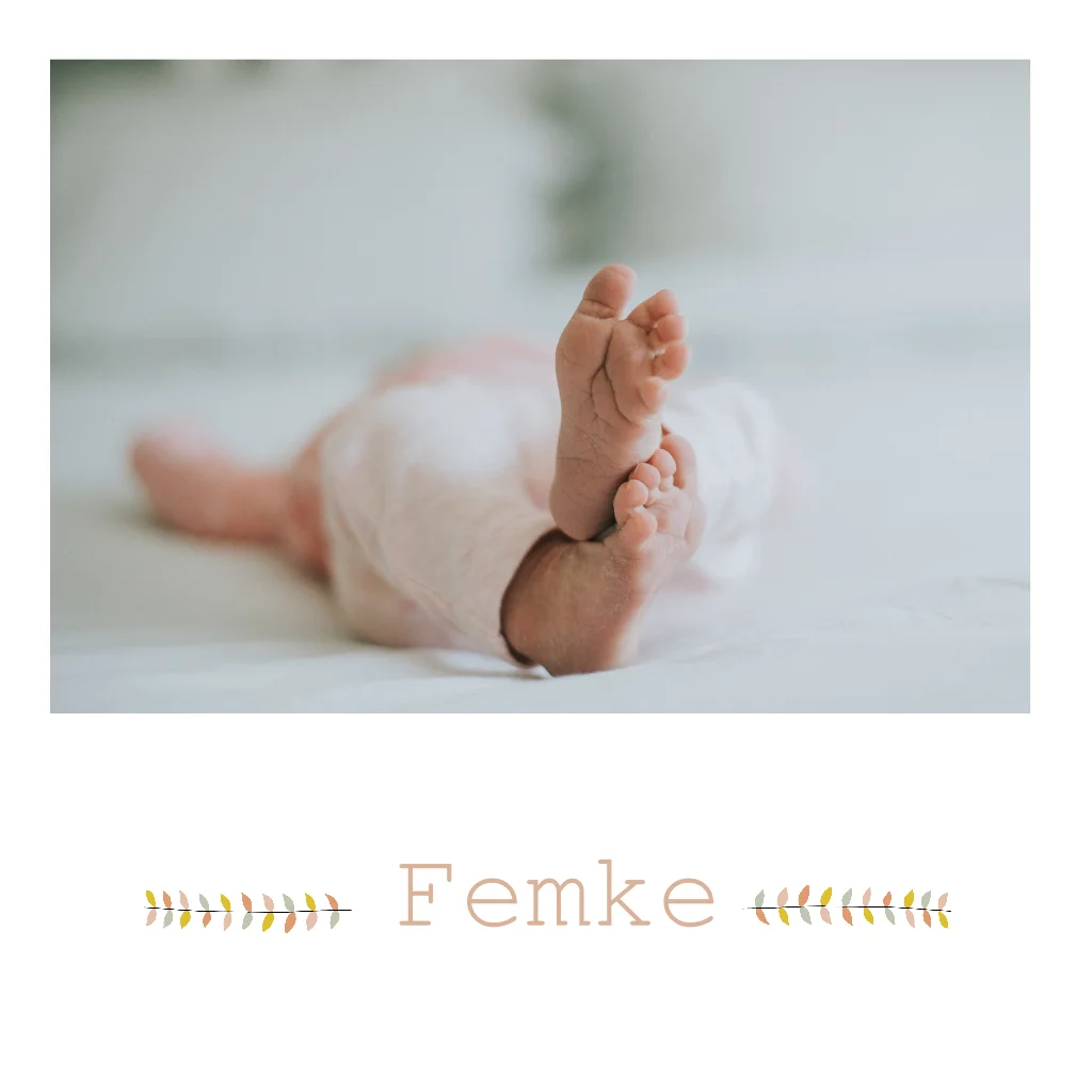 Een lief geboortekaartje met blaadjes. en een mogelijkheid voor een eigen foto. Een geboortekaartje in warme kleuren, deze is ook te bestellen in een ander formaat. Heb je vragen? mail ons gerust.