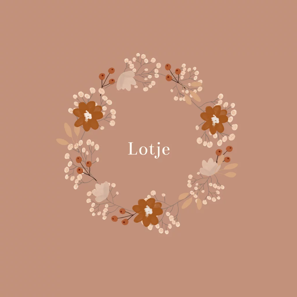 Een mooi geboortekaartje in herfstkleuren met een krans en op de voorkant.