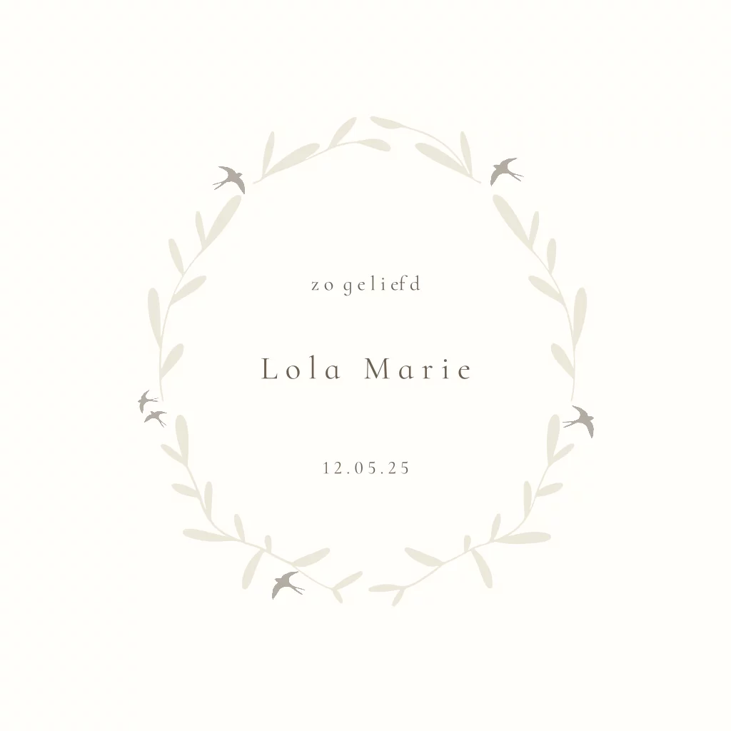 Een lief geboortekaartjes met een krans en zwaluw vogeltjes. Je kan voor elk gezinslid een vogeltje op het kaartje zetten of er afhalen. Kleuren kunnen gewijzigd worden.