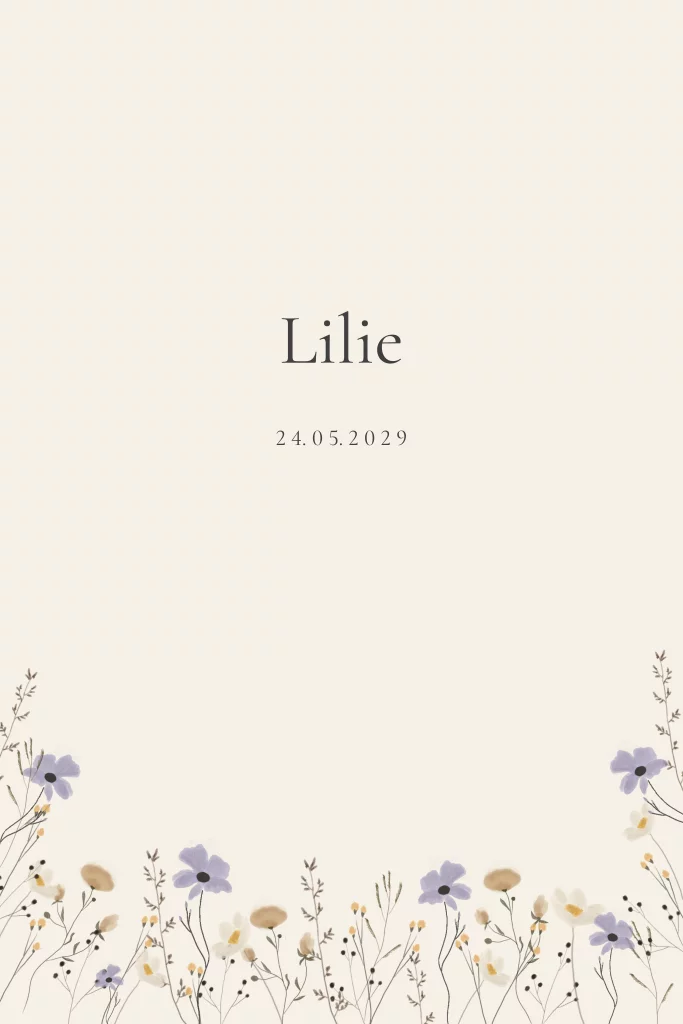 Een mooi lief geboortekaartje met veld bloemen in lila tinten. Dit mooie en lieflijke kaartje is perfect voor de aankondiging van de geboorte van jullie dochter. De zachte lila tinten en de charmante veldbloemen zorgen voor een romantische en rustige uitstraling, waardoor dit kaartje perfect past bij de lente- of zomerse geboorte van jullie kindje.