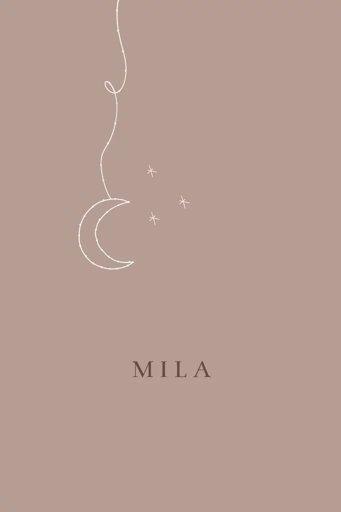 Een lief geboortekaartje met een maan aan een slinger. Kleuren kunnen gewijzigd worden.