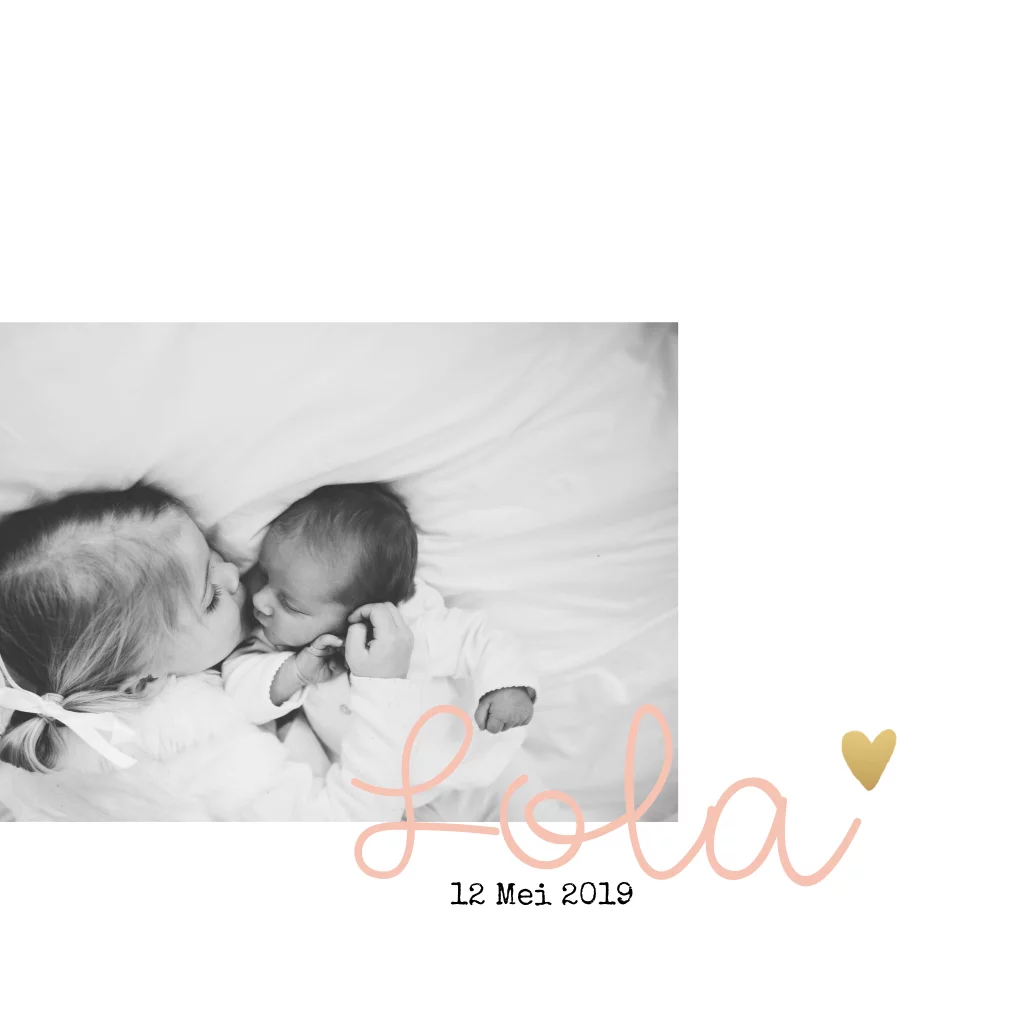 Een lief eenvoudig enkel geboortekaartje met een sierlijk lettertype en een goud hartje en de mogelijkheid voor een eigen foto.