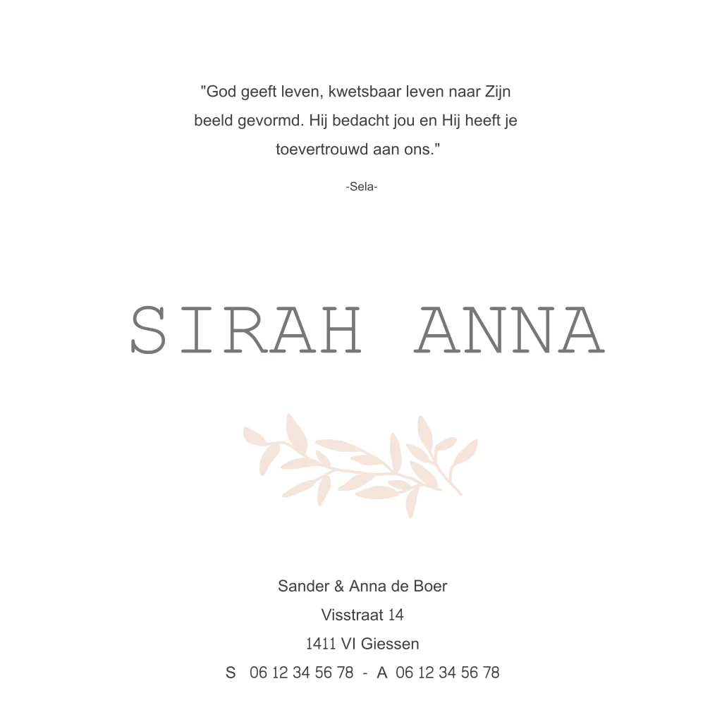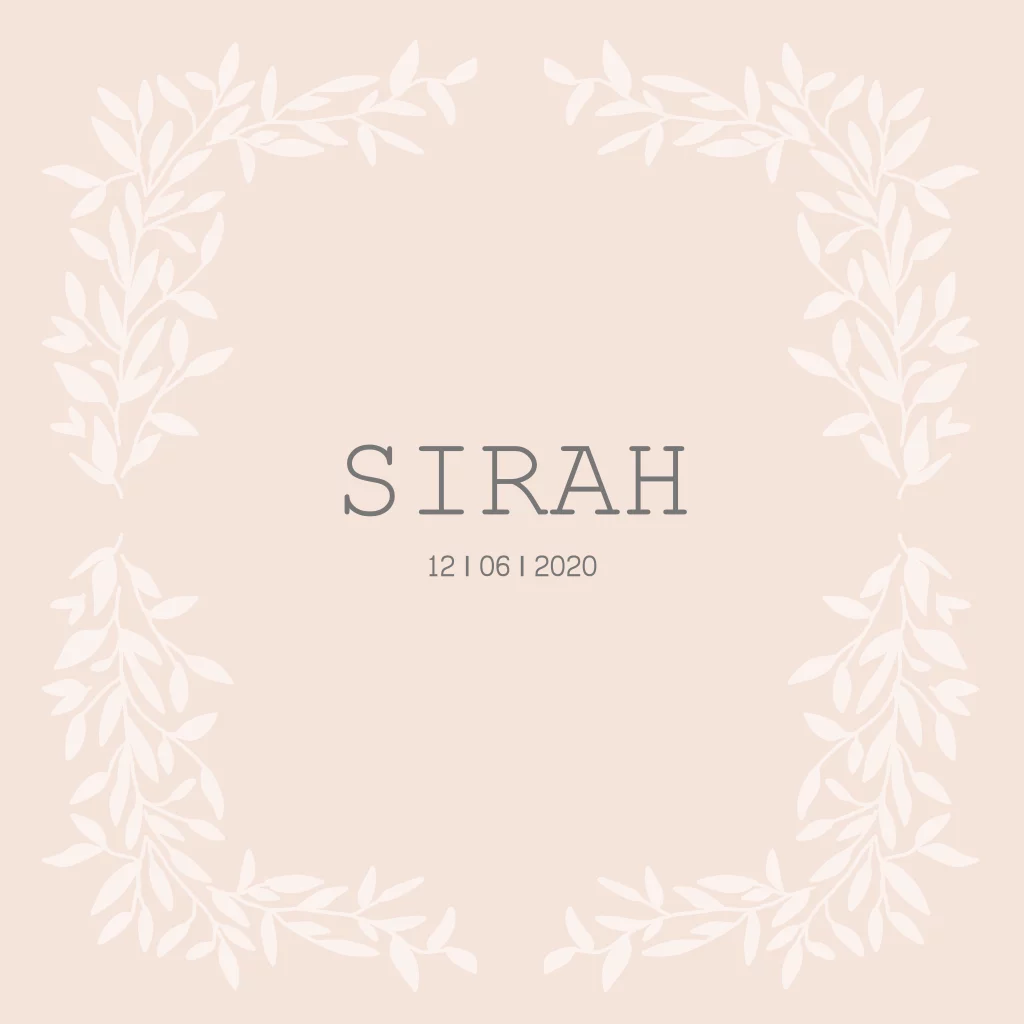 Een lief eenvoudig en strak geboortekaartje met een watercolor blaadjes rand. De blaadjes kunnen ook van kleur veranderd worden.