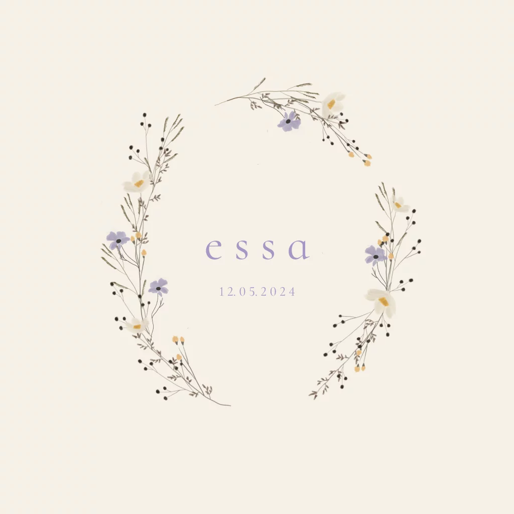Een heel eenvoudig geboortekaartje met een krans vol takjes en bloemetjes in fleurige kleurtjes.