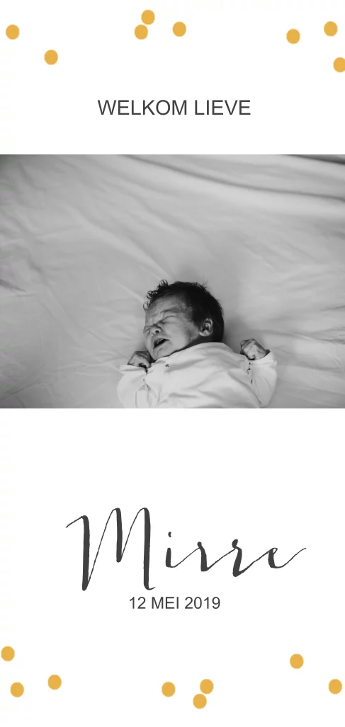 Een lief en strak en eenvoudig geboortekaartje, met stippen en de mogelijkheid voor een eigen foto. Wil je iets anders of zijn er vragen mail ons gerust, dan helpen wij je graag!
