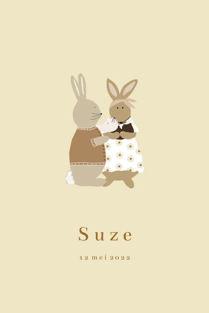 Een lief geboortekaartjes met ronde hoeken in gele tinten met konijnen. Kleuren kunnen gewijzigd worden.