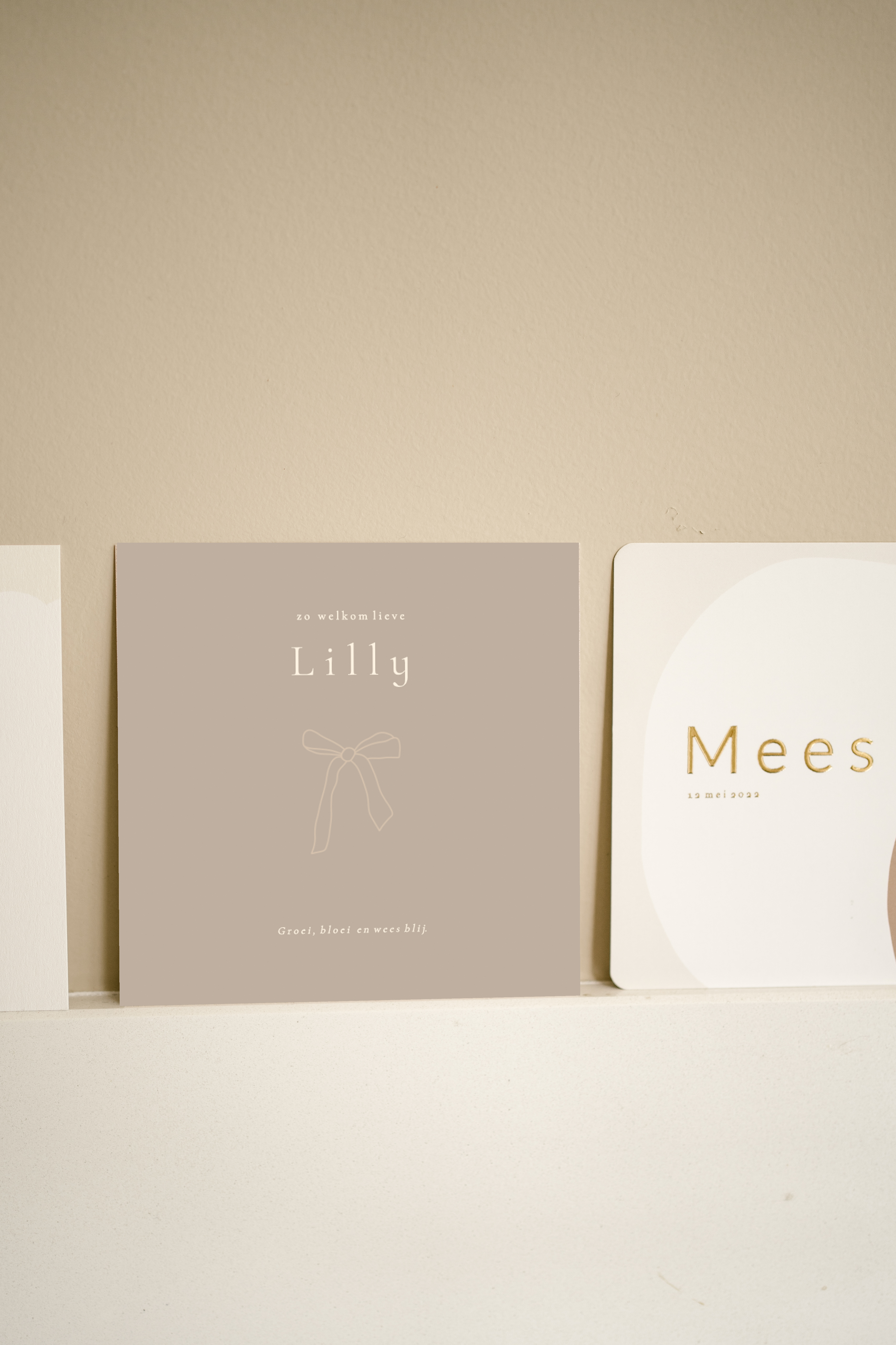 Een mooi minimalistische geboortekaartje met een lijntekening van een strik. Achtergrond kleur en tekst kleuren kunnen gewijzigd worden.