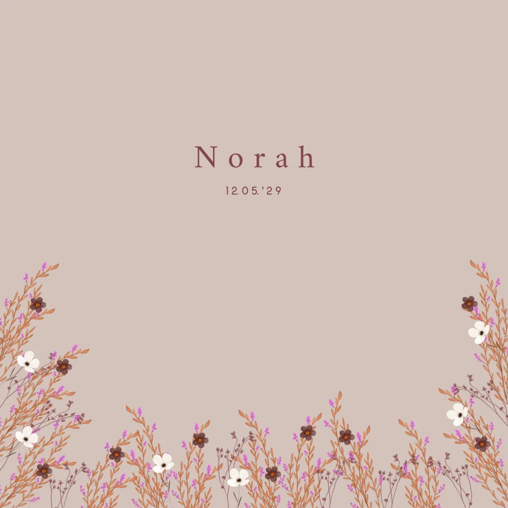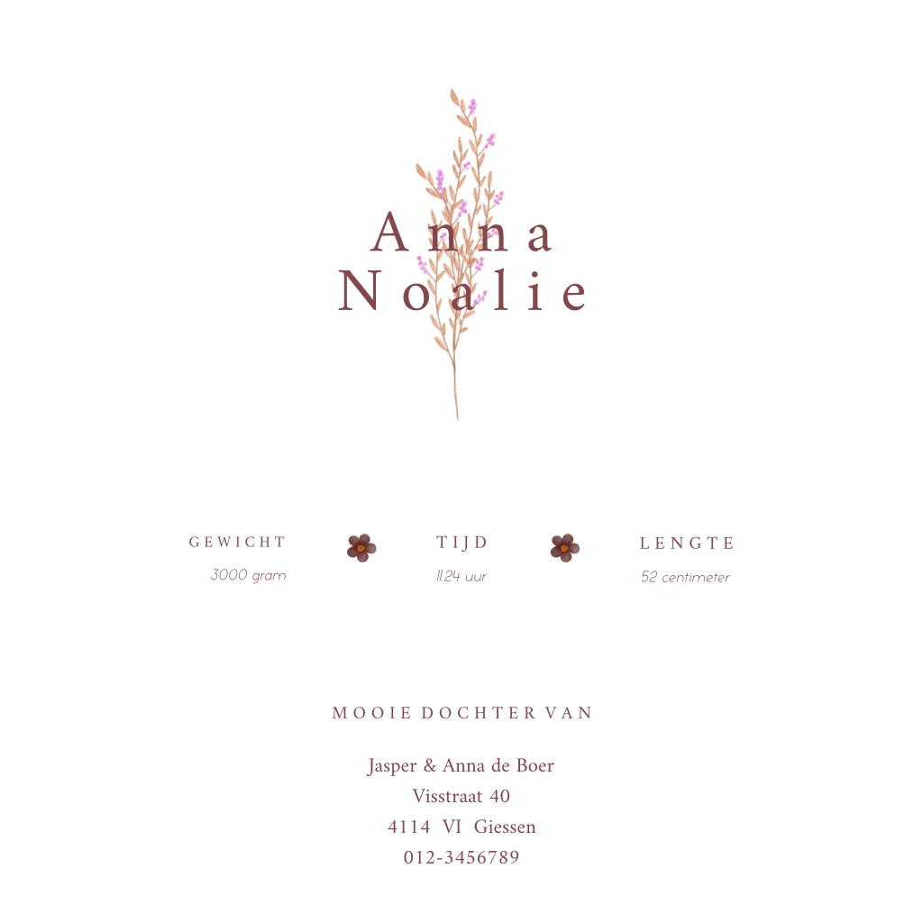 Een mooi geboortekaartje in vrolijke kleuren met bloemen en takjes.