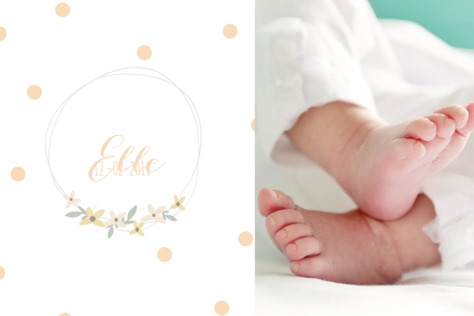 Een lief enkel geboortekaartje, met een de mogelijkheid voor een eigen foto, zodat het een heel persoonlijk kaartje wordt. In de kleuren, perzik, mosterd, lichtgrijs, oud groen. Als je iets wilt veranderen of bijvoegen en het lukt niet, mail ons dan!