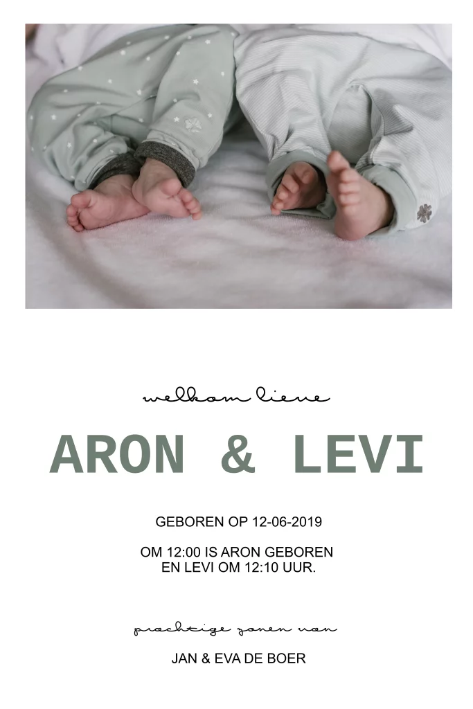 Een lief eenvoudig geboortekaartje voor een tweeling ( kan ook voor een eenling ). Verander de foto en je hebt een heel mooi persoonlijk geboortekaartje.