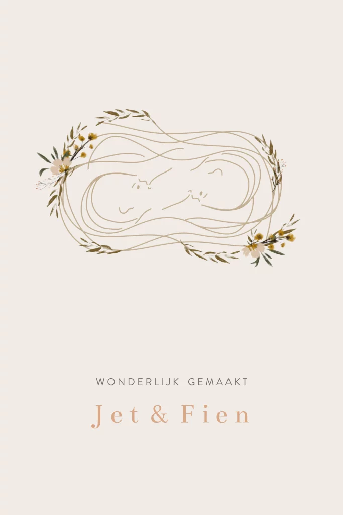 Een lief eenvoudig kaartje met een lijntekening van een tweeling en bloemen. En de christelijke tekst Wonderlijk gemaakt.