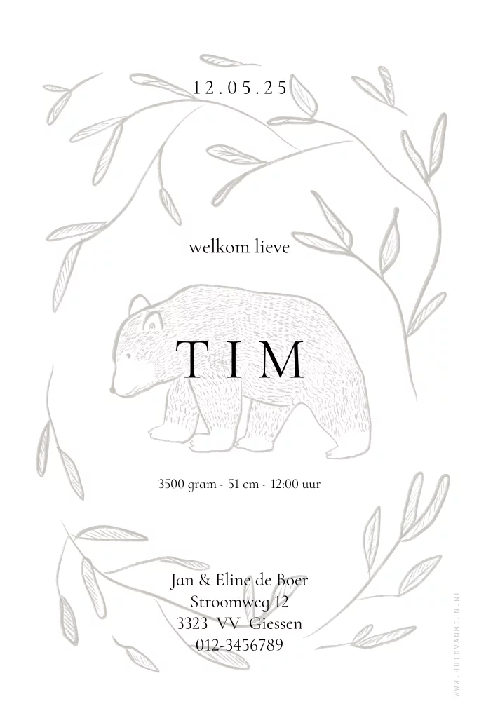 Een mooi geboortekaartje met een beer en takjes gedrukt op kalkpapier.