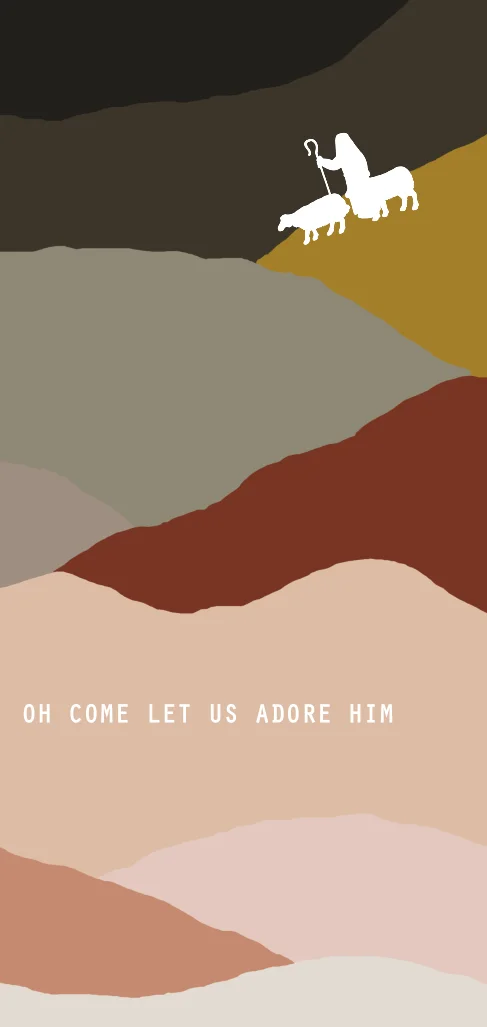 Een kerstkaart getekende kleurige bergen en een herder met schapen. Leuk om te versturen of gewoon om op te hangen in je huis.