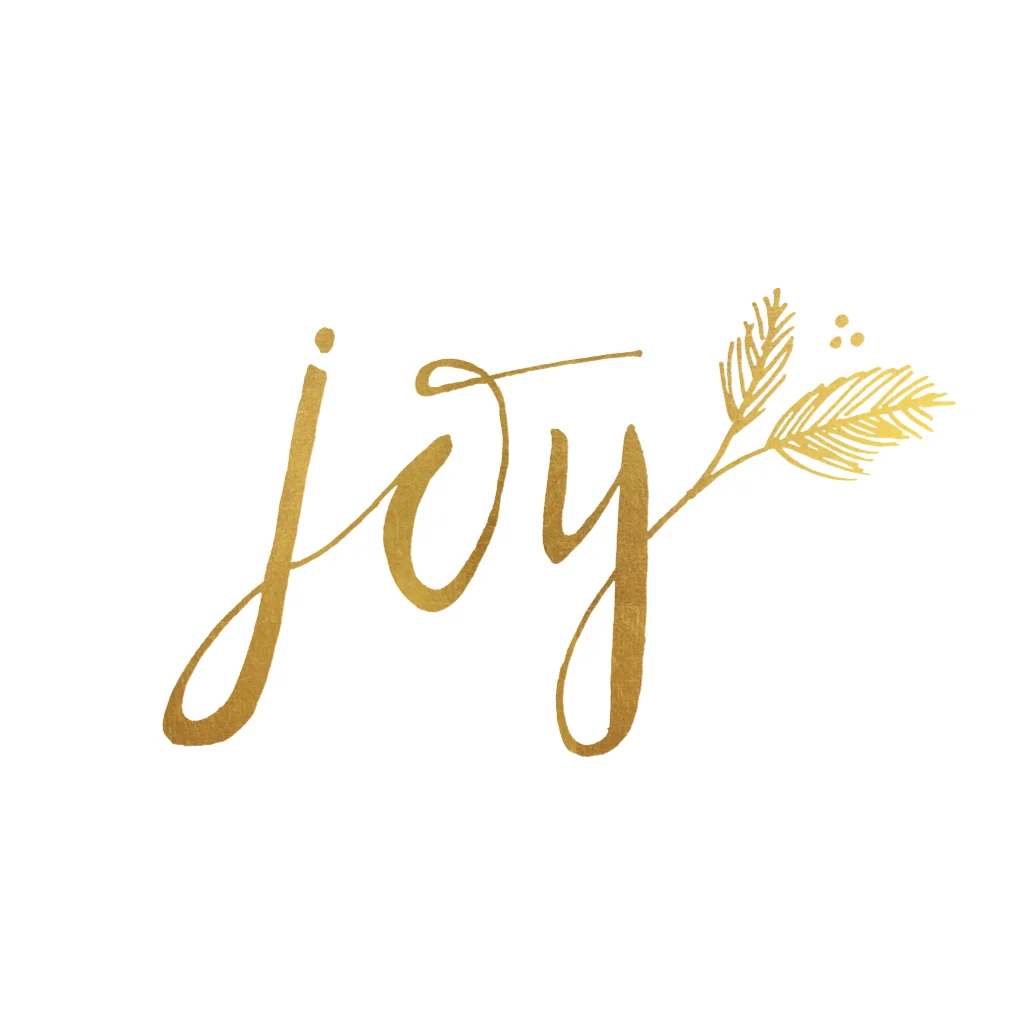 Een kerstkaart met een handlettering tekst "Joy" in goud look.