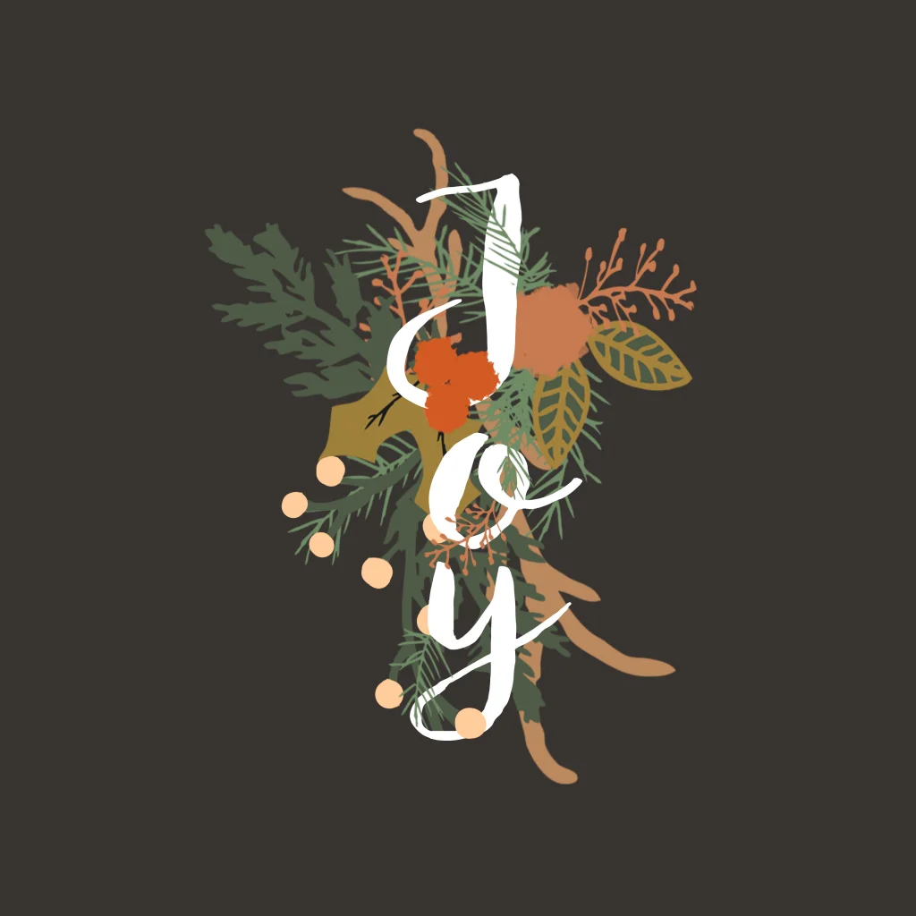 Een kerstkaart met een vaste tekst Joy en getekende blaadjes en bloemen. De tekst aan de achterkant kan gewijzigd worden.
