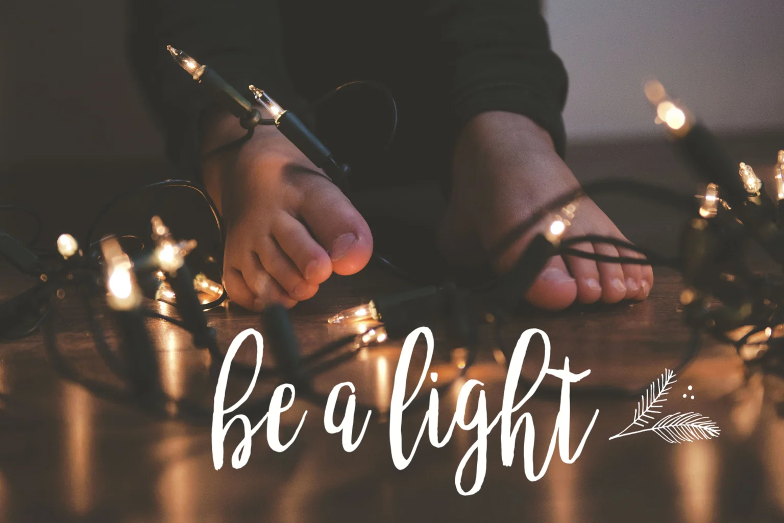 Een foto kerstkaart met een handgetekende tekst "be a light"