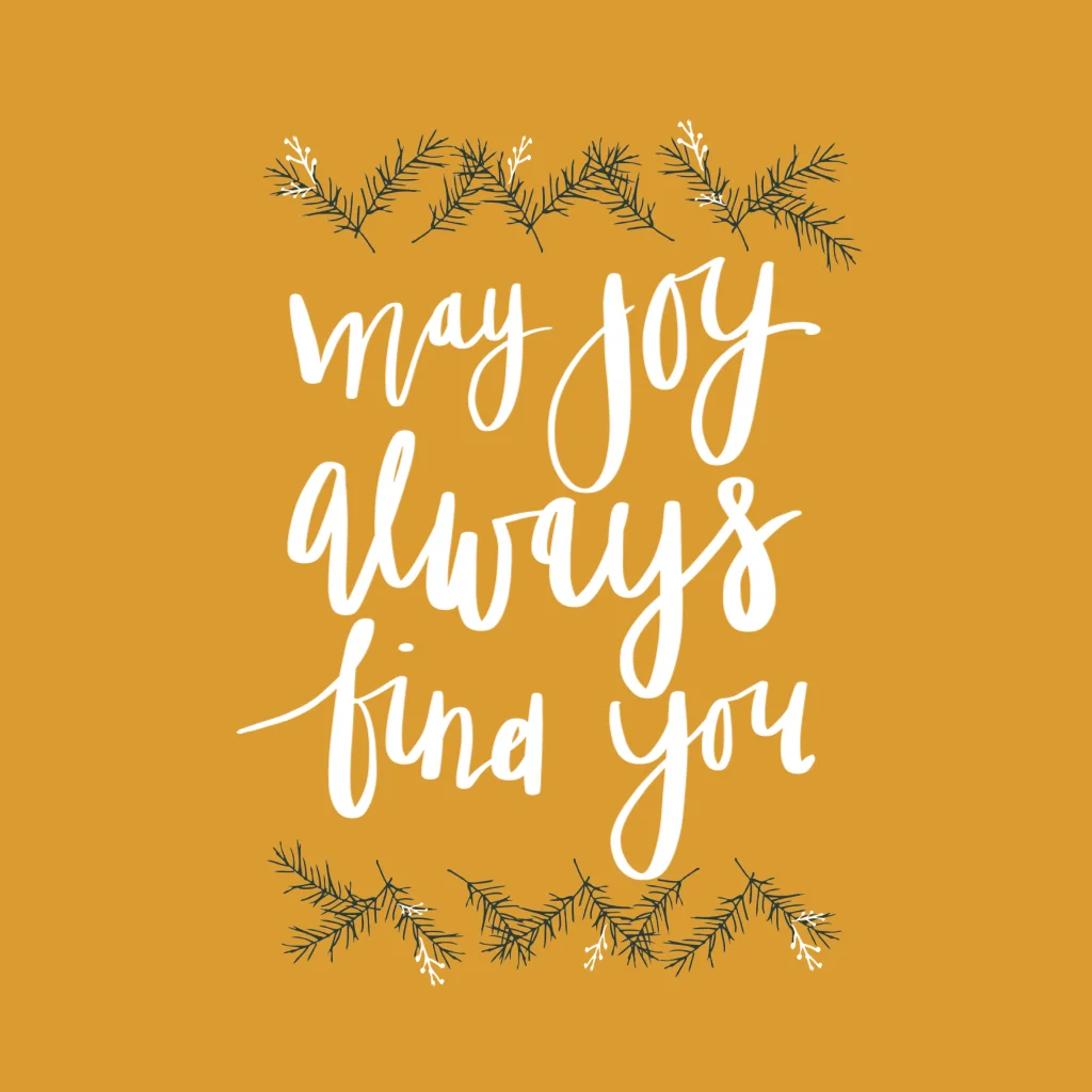Een handlettering kerstkaart met de tekst "may joy always find you" en handgetekende blaadjes.