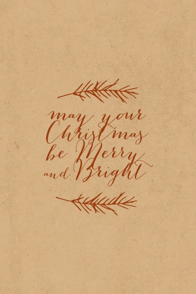 Een kerstkaart met een vaste tekst met handgetekende blaadjes en een kraft look achtergrond. Leuk om te versturen of gewoon om op te hangen in je huis.