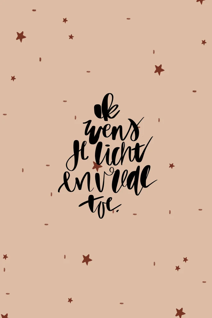 Een kerstkaart met een handlettering tekst "Ik wens je licht en vrede toe" en een oud roze achtergrond met sterretjes en streepjes.