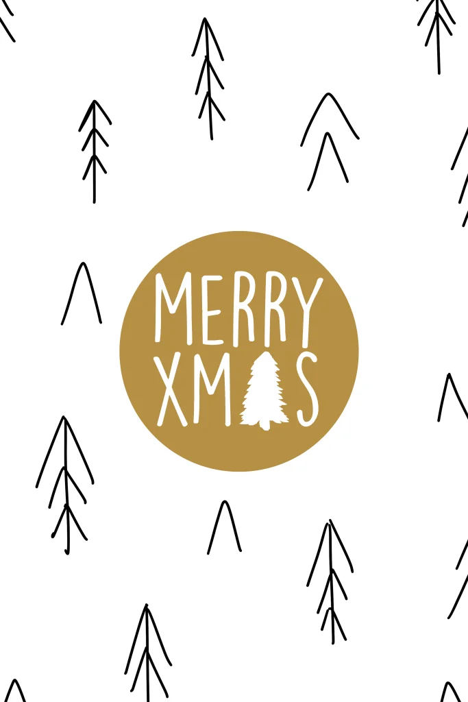 Een kerstkaart met zwart witte kerstbomen achtergrond en een label sticker "Merry Xmas".