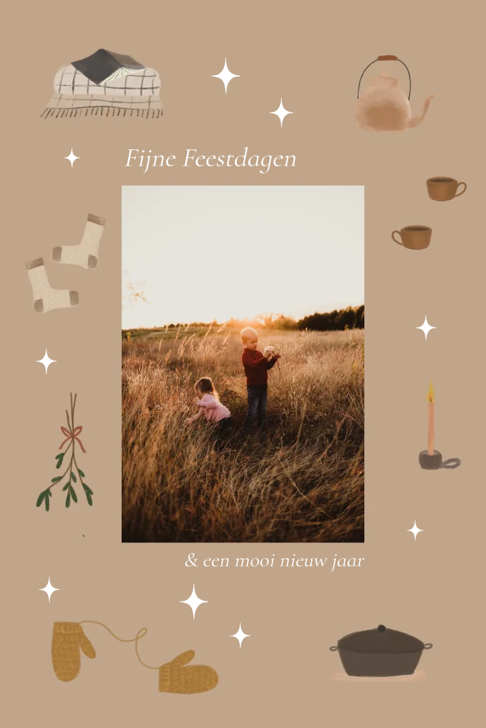 Een mooie kerstkaart met de mogelijkheid voor een eigen foto en getekende illustraties. De Tekst, foto en de kleuren van de tekst en achtergrond kunnen gewijzigd worden.