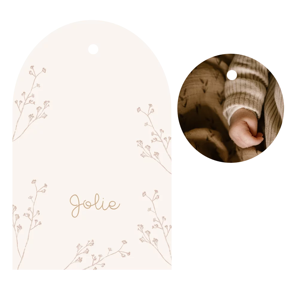 Een mooi boog geboortekaartje met een rond labeltje die je met een lintje aan elkaar kan bevestigen. Lint zit er niet bij, deze moet je er los bij bestellen.