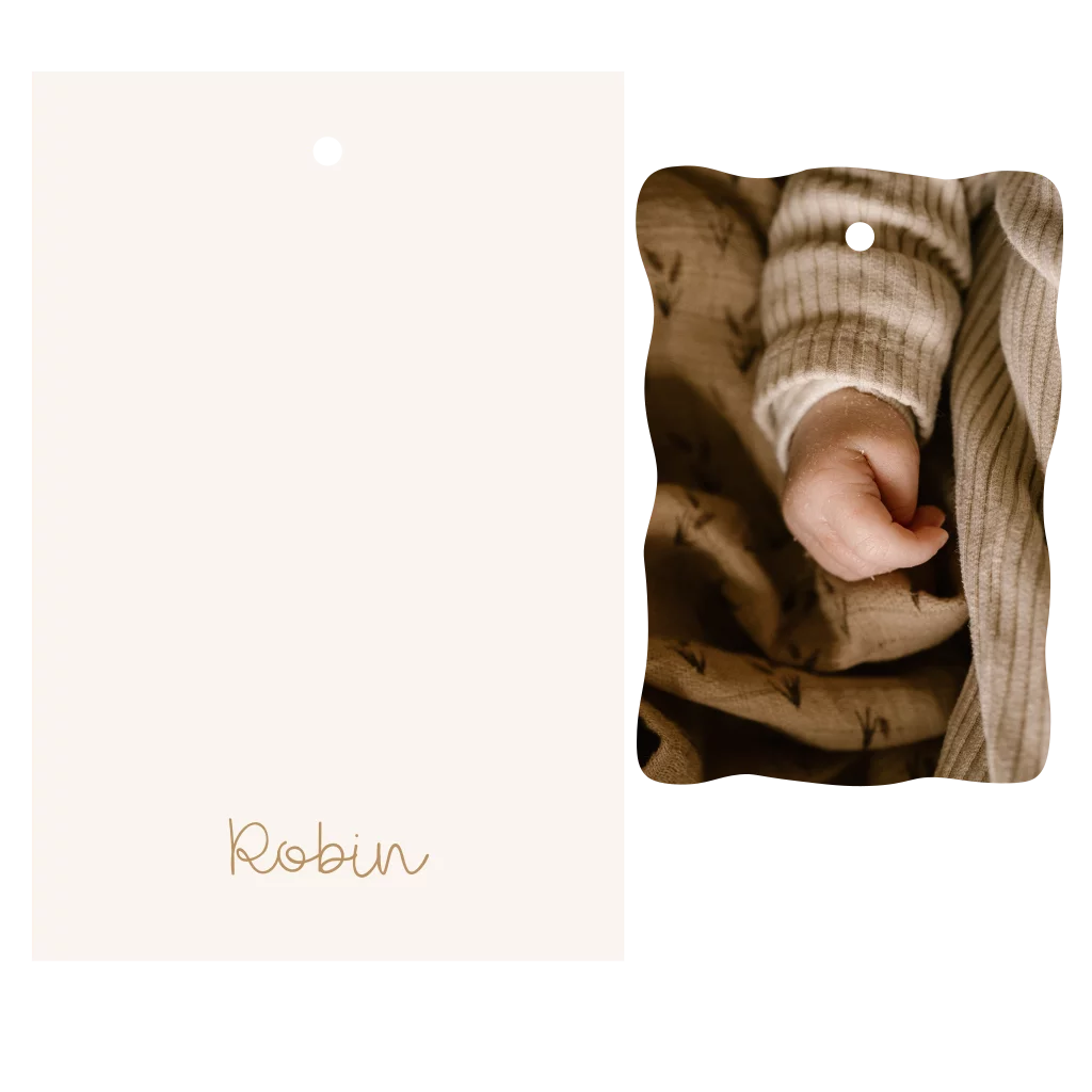 Een mooi geboortekaartje met een label met een schulprand, die je met een lintje aan elkaar kan bevestigen. Lint zit er niet bij, deze moet je er los bij bestellen.