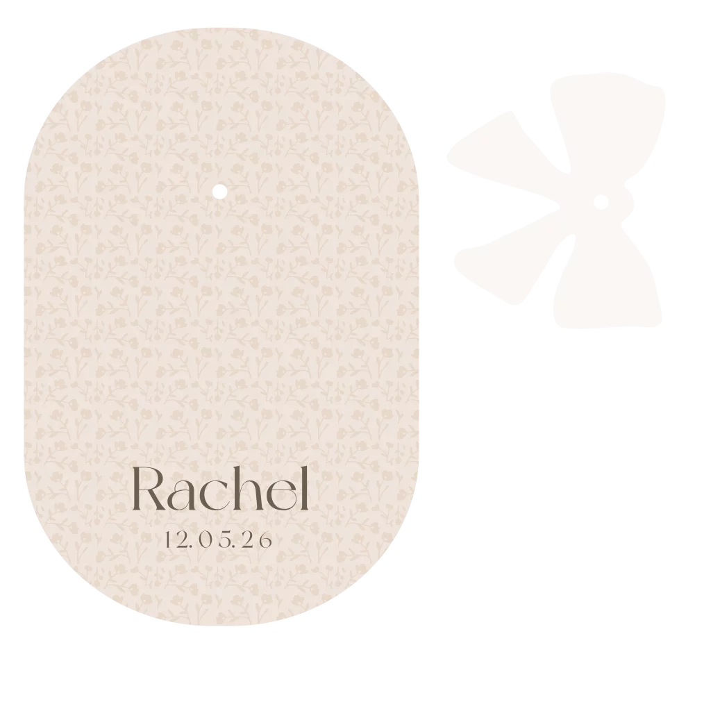 Een super leuk origineel geboortekaartje in een ovale vorm en een label in de vorm van een strik, die je kan bevestigen met een touwtje of een splitpen. ( Het lint of splitpen moet je er los bij bestellen ) Kleuren en tekst kunnen aangepast worden.