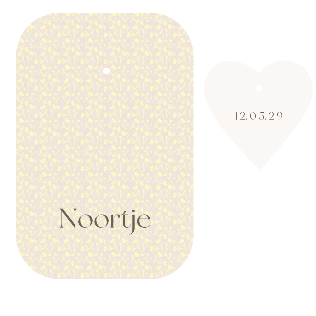 Een super leuk origineel geboortekaartje in een vorm met ronde hoeken en een hartjes label, die je kan bevestigen met een touwtje of een splitpen. ( Het lint of splitpen moet je er los bij bestellen ) Kleuren en tekst kunnen aangepast worden.