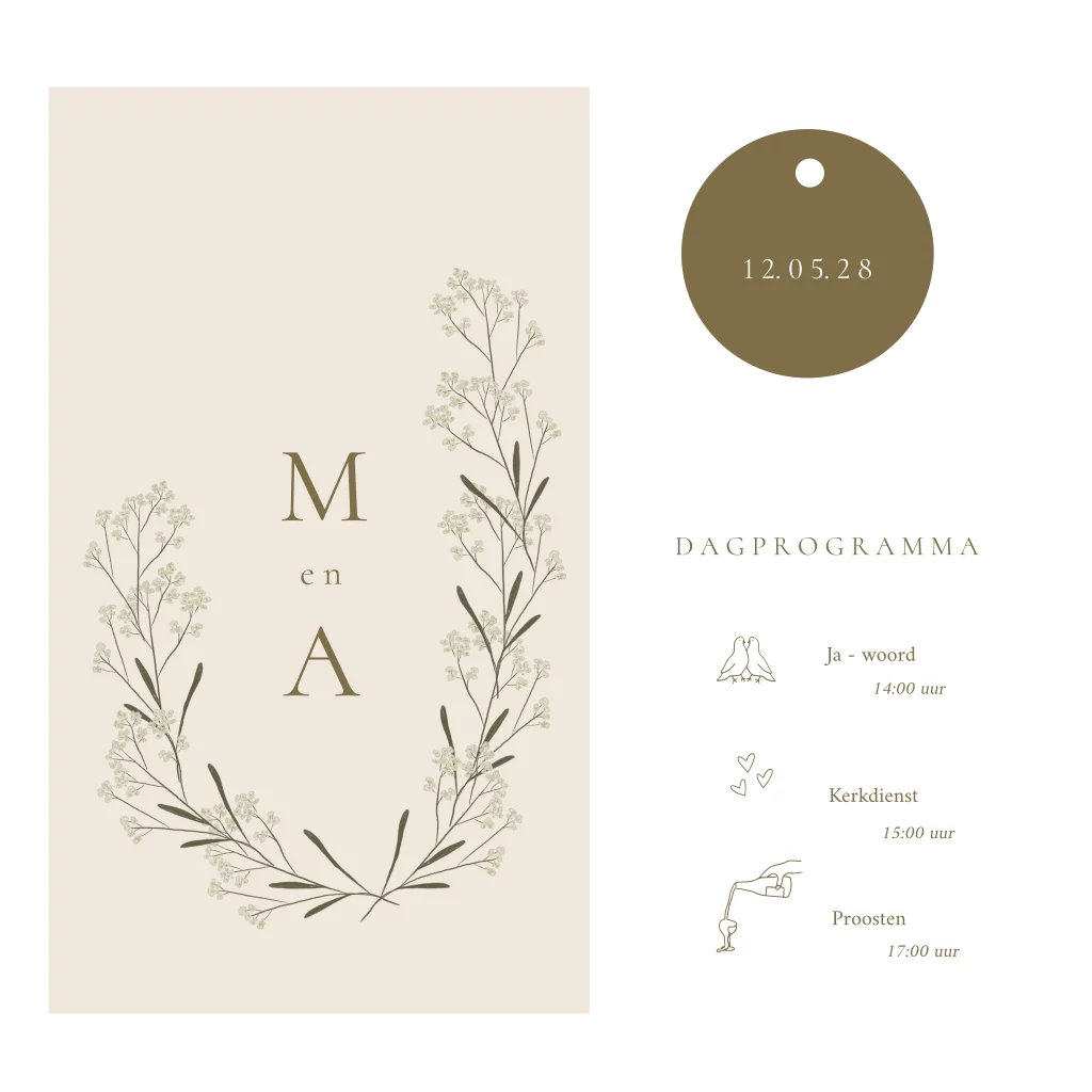 Op zoek naar een elegante en chique trouwkaart? Ontdek onze prachtige Trouwkaart met rond labeltje en een klein kaartje. Dit unieke ontwerp biedt de mogelijkheid om het kleine kaartje met een lintje aan de kaart te bevestigen of apart toe te voegen, waardoor je een persoonlijk tintje aan je uitnodiging kunt geven. Let op, het lint wordt niet meegeleverd, maar kan eenvoudig apart worden besteld voor een complete look. Deze luxe trouwkaart is perfect voor diegenen die op zoek zijn naar een originele en romantische uitnodiging. Met prachtige details zoals een veldbloemen krans of takjes. De zachte kleuren beige, zand geven de kaart een verfijnde uitstraling, waardoor het een perfecte keuze is voor een bruiloft met een romantisch thema. Bestel vandaag nog en maak je bruiloftsuitnodigingen compleet met deze prachtige kaart.