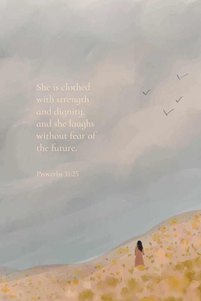 Poster met een illustratie van een vrouw en bloemen en een Bijbeltekst.