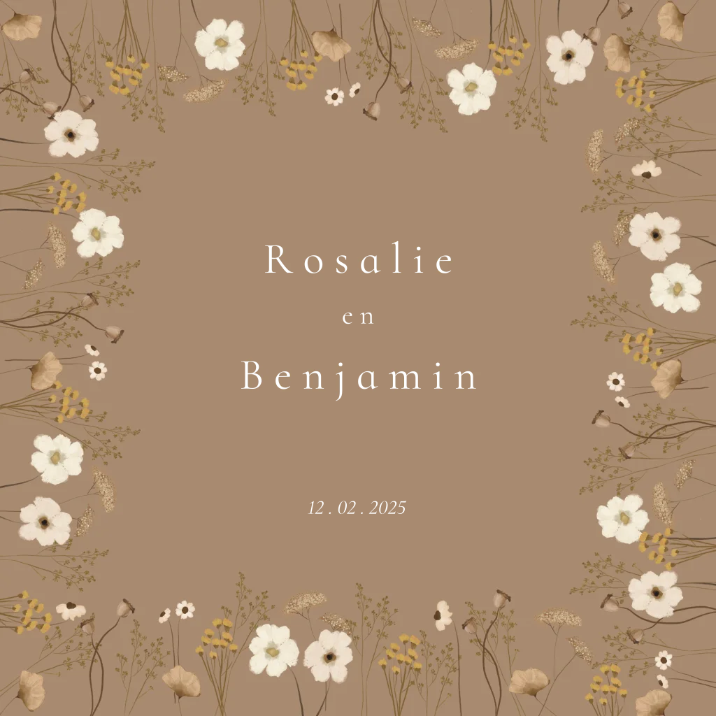 Een mooie trouwkaart met droog bloemen in aarde tinten. De tekst op de voorkant is goudfolie. Kleur van de achtergrond en van de folie kan gewijzigd worden.