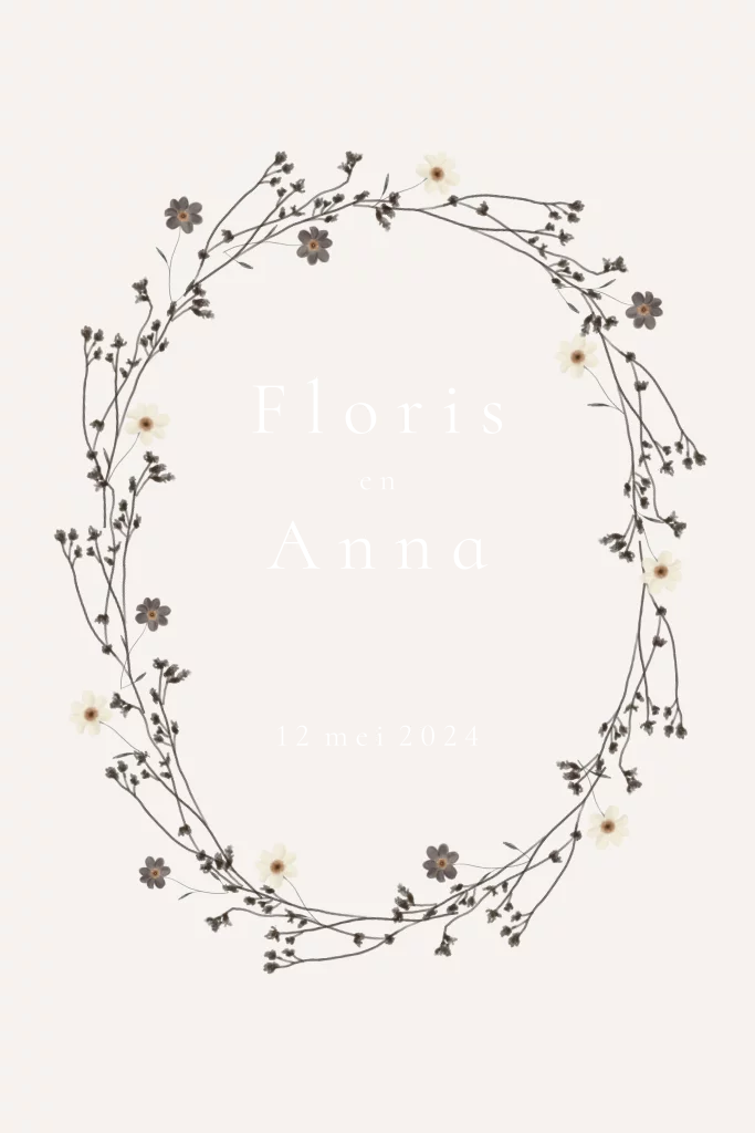 Een mooie trouwkaart met een krans van takjes en lieve kleine bloemetjes.