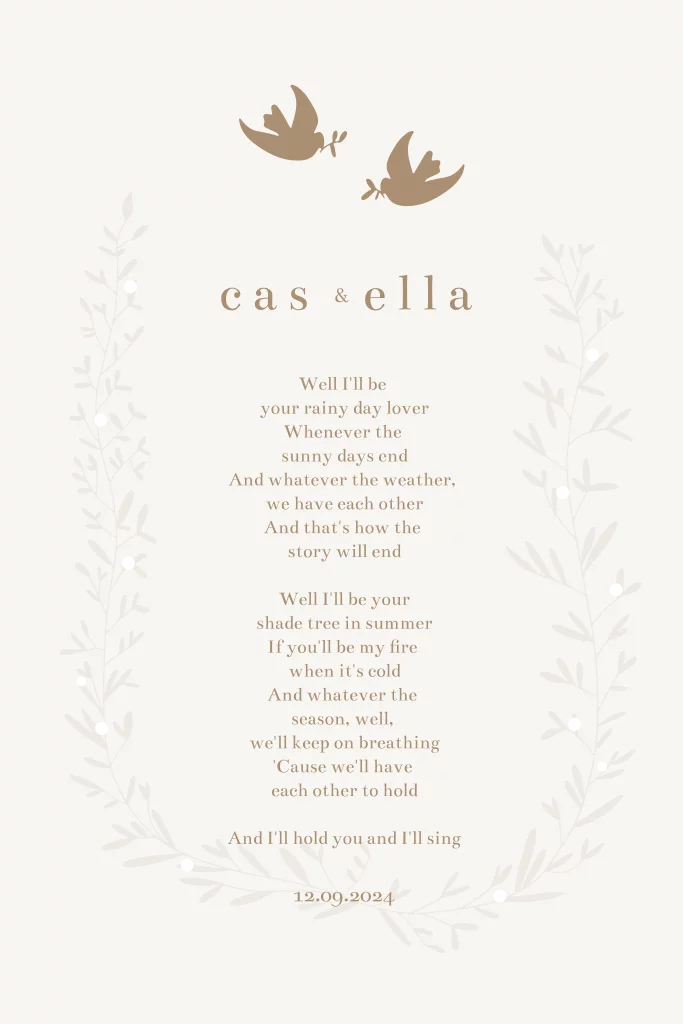 Een minimalistische trouwkaart met takjes en duiven en rosegoud folie.