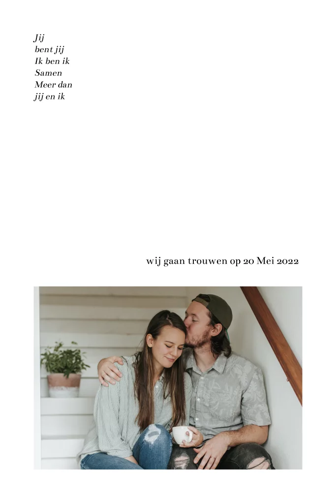 Een mooie eenvoudige trouwkaart, kan met of zonder eigen foto. De naam is op de voorkant met goudfolie.