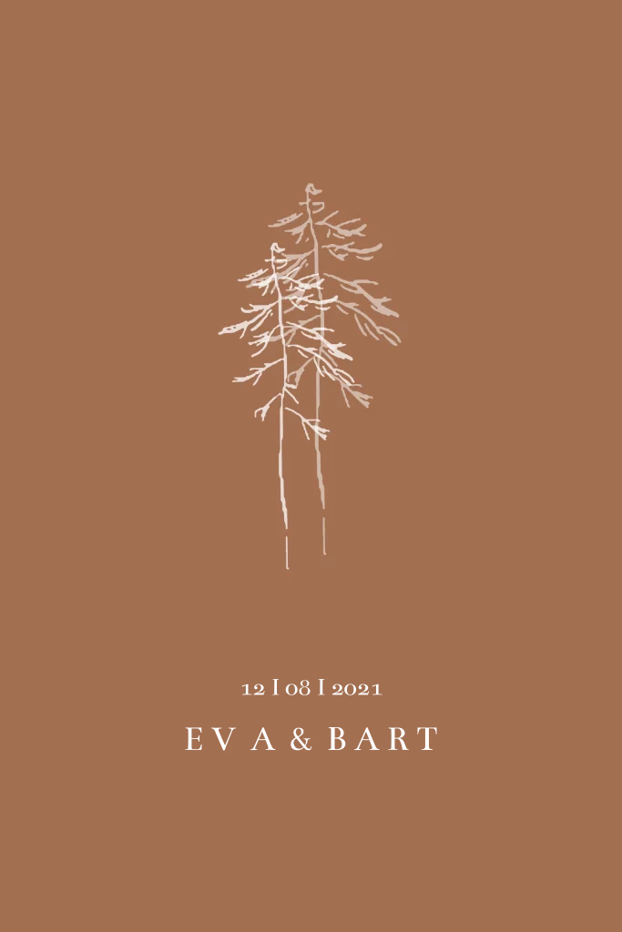 Een heel mooie trouwkaart met bomen echt voor een winter bruiloft, met de naam en de datum in goudfolie. In mooie warme kleuren.