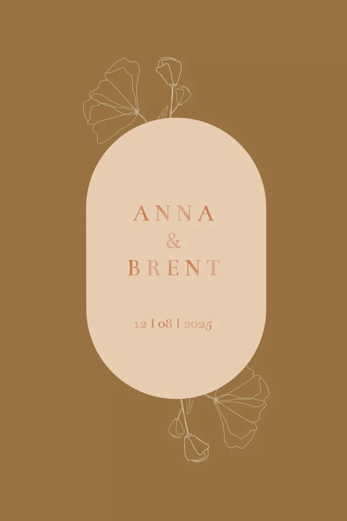 Een heel mooie trouwkaartje met de naam en de datum in koper folie. Kleuren kunnen gewijzigd worden.