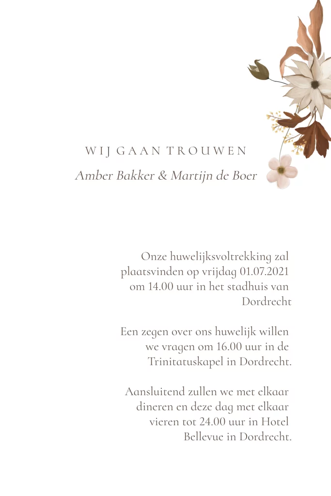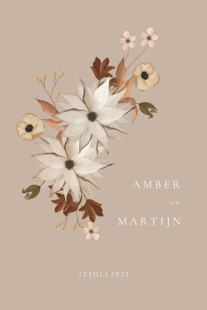 Een mooie warme trouwkaart met geschilderde bloemen in herfstkleuren. Teksten, achtergrond kleuren kunnen gewijzigd worden.