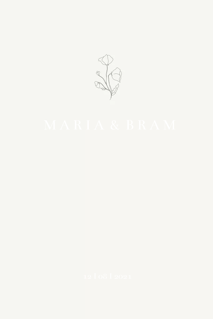 Een heel mooie trouwkaartje in naturel tinten met de naam en de datum in goudfolie. En een lijntekening van een bloem.