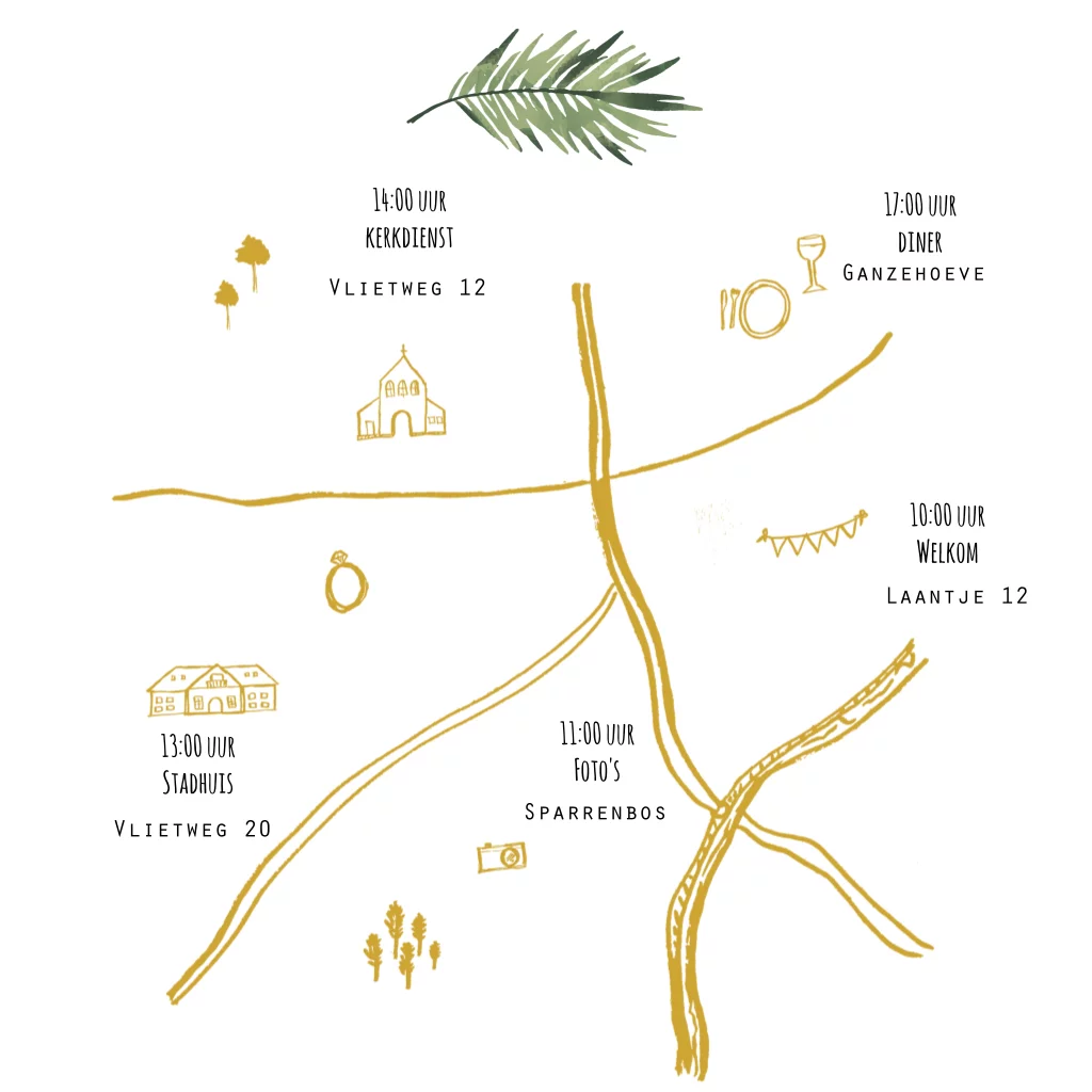 Een mooie dagprogramma, met handgetekende elementen in deze trouwhuisstijl. Deze "wedding maps" kaart is helemaal aan te passen naar wens. Wil je iets anders of zijn er vragen mail ons gerust, dan helpen wij je graag!