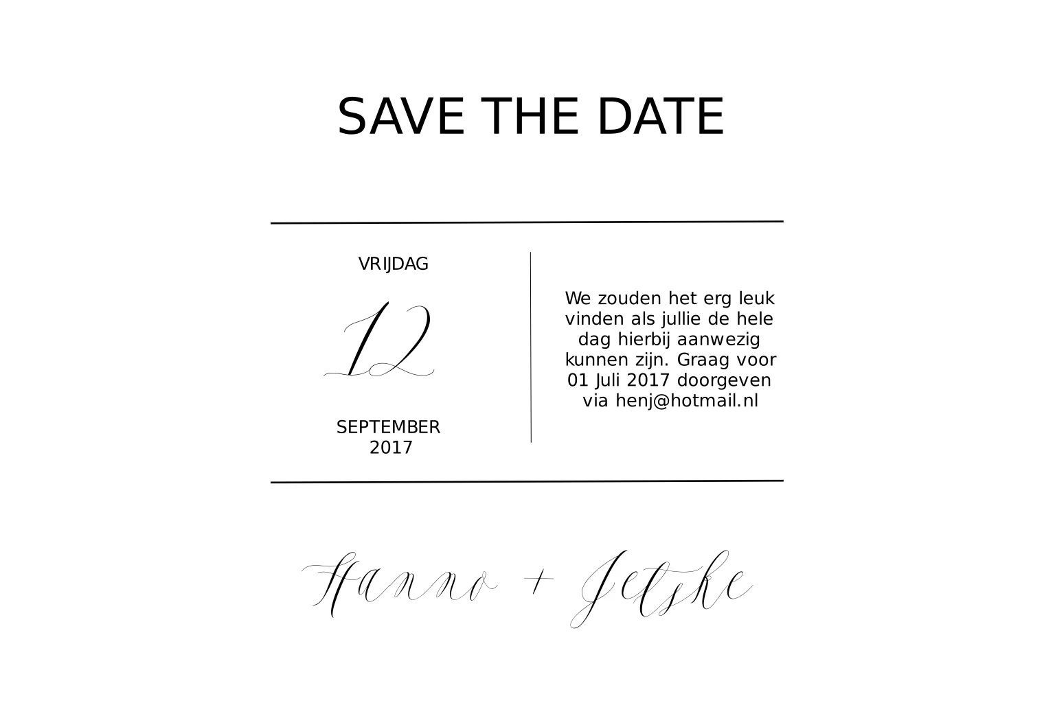 Een chique Save the Date kaart met in typografie stijl, heel eenvoudig en in de kleuren zwart/ wit.
