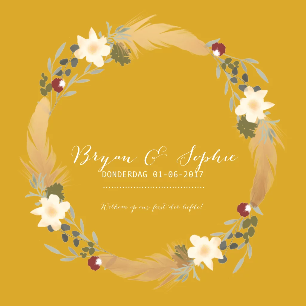 Een mooie trouwhuisstijl, bohemian indian summer stijl. Deze trouwhuisstijl kan je gebruiken voor heel je kaarten lijn. Wil je iets anders of zijn er vragen mail ons gerust, dan helpen wij je graag!