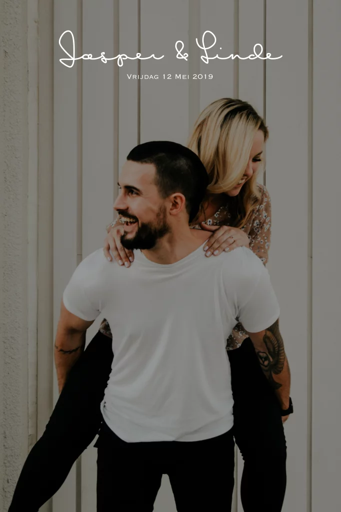 Een mooie persoonlijke foto trouwkaart in grijs/bruine tinten. Laat een mooie pre-wedding shoot doen en gebruik deze voor je kaartenlijn. De tekst en kleuren kunnen worden aangepast!
