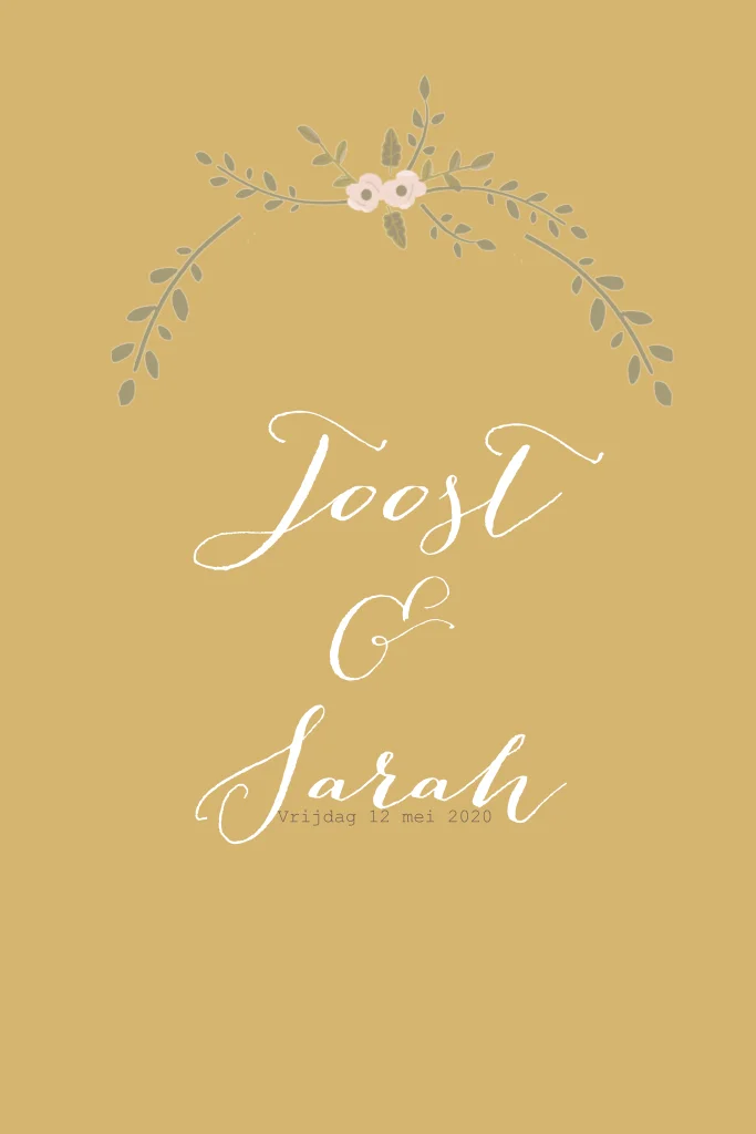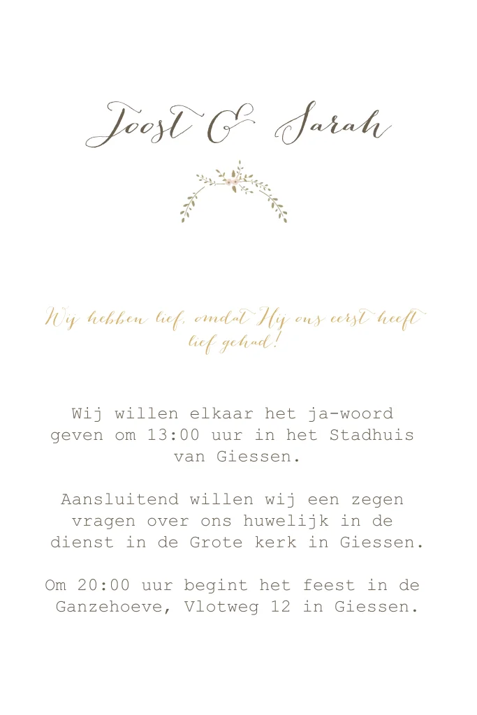 Een mooie trouwkaart, met handgetekende elementen in deze trouwhuisstijl. Deze stijl kan je door trekken in al je kaarten. Wil je iets anders of zijn er vragen mail ons gerust, dan helpen wij je graag!