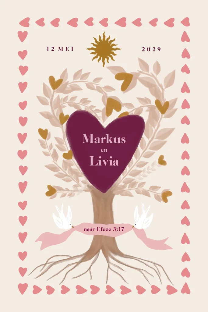Op zoek naar een mooie trouwkaart met een betekenis. Deze hippe trouwkaart is voorzien van een boom met een hart naar Efeze 3:17. De hartjes en de tekst kan je ook qua kleur naar jullie wens aanpassen.