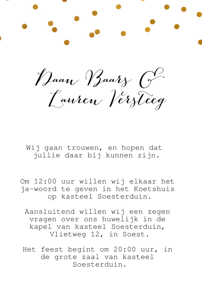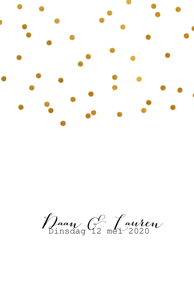 Een mooie trouwhuisstijl, met gouden stippen. Deze trouwhuisstijl kan je gebruiken voor heel je kaarten lijn. Wil je iets anders of zijn er vragen mail ons gerust, dan helpen wij je graag!